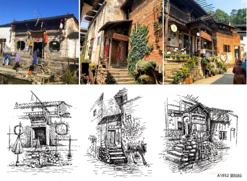 9月24日,师生团队来到历史古村落理坑,开展古村落调研与写生教学。理坑是婺源著名的徽派民居聚集地,保存着丰富的砖雕、木雕和石雕等传统民间艺术精品,其图案精美绝伦、寓意隽永,成为诸多艺术家获取创作灵感的重要源泉。在村边的小溪旁,吴小亮主任与周裕昌老师为同学们现场示范古建筑写生,详细讲解写生技巧。