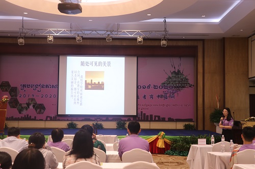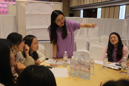 随后,首都师范大学国教学院林秀琴副院长向大家讲解了如何设计以学生为中心的教学活动,林老师说,“课堂应是活动的、交际的、创造的课堂,教师要用活动引燃你的课堂,让学生多多参与进来。”金边皇家大学DHY汉语中心周丽云主任分享了中柬课堂教学对比暨跨文化适应案例与经验,周主任提到,“学生们学习汉语有不同的动机,针对不同的动机要采取不同的方法。” 下午,志愿者们分别按照“风景名胜组”/“高棉水果组”分组互动,分享彼此的教学游戏法。短短一个每位志愿者教师就学习到了超过30个教学游戏,收获满满。