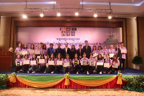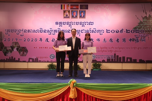 12日下午5时,闭幕式上,领导专家为柬埔寨24位在国家汉办组织的“爱国心,青春颂”诗歌征稿大赛中荣获奖项的志愿者教师颁奖。志愿者代表发言,从志愿者的角度对此次培训的内容进行总结,表达了对此次培训的感谢。柬埔寨皇家科学院孔子学院中方院长柴克清先生致闭幕式总结辞,他表示,“中柬两国自古以来就是传统友谊国,一直以来中柬领导人高度重视加强两国文化交流和增进两国人民之间的相互了解。希望老师们能够在今后的教学过程中,将所学的教学理论和方法更好地运用到汉语课堂的实践中,为中柬两国语言学习、文化交流、乃至民心相通贡献自己的青春和力量。”