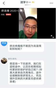 刘松医生结合自己援鄂抗疫的亲生经历向大家讲解关于新冠状病毒防治的有关知识,并向大家分享了自己对于此次疫情的感悟:身为医生的职责就是治病救人,救死扶伤不为做英雄,为自己的职责就应该“向前去”,如果医生都不冲在一线,那人民的身体健康谁来保护。直播中刘医生时刻提醒着同学们要对疫情更加重视,即使不在学校也应该认真学习,在家也要做好防护措施,少出门、多洗手、多通风。刘医生向同学们讲解防护新冠肺炎的同时也耐心地解答同学们提出的问题:病毒可能变异么?新冠病毒感染者存在后遗症么?疫苗是否进行人体临床试验等问题。