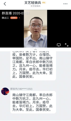 魏远江医生用图文并茂的的形式为同学们分享了自己在援鄂过程中的所见所看所感,从报名到培训再到第一次接触病人。很生动地告诉大家,抗疫胜利来之不易。魏医生在直播中提到此次疫情对我们国家对人民都是一次很大的挑战,之所以能很好的控制,每一个人都贡献了自己的一份力量,也很好的体现了中国人民的团结合作和中华民族的强大凝聚力。在课堂中也表达对艺院学子关爱,希望经过疫情能让同学们更珍爱生命,爱自己,爱国家。